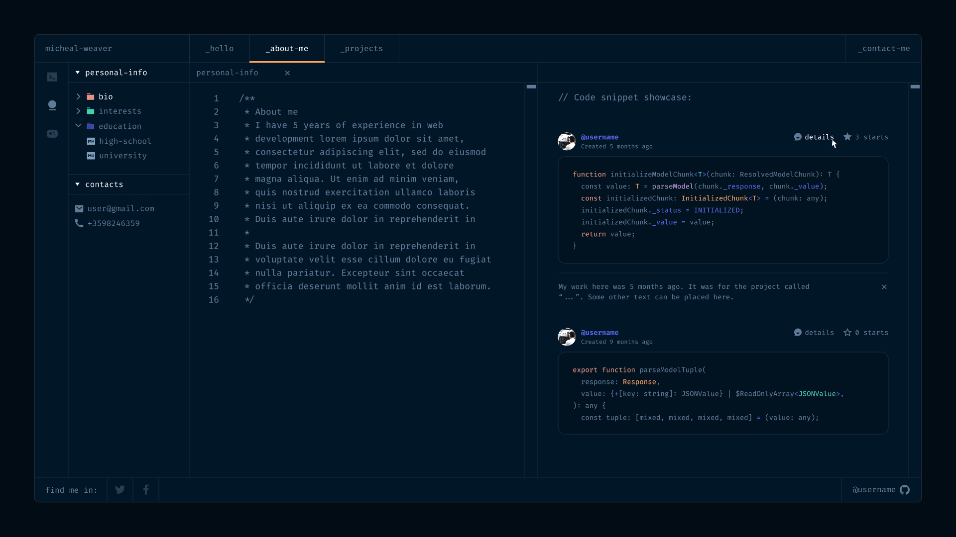 This is a free portfolio design concept for developers, inspired by the look and feel of Visual Studio Code. It’s perfect for creating a personal CV or portfolio site with a modern, developer-friendly vibe.
